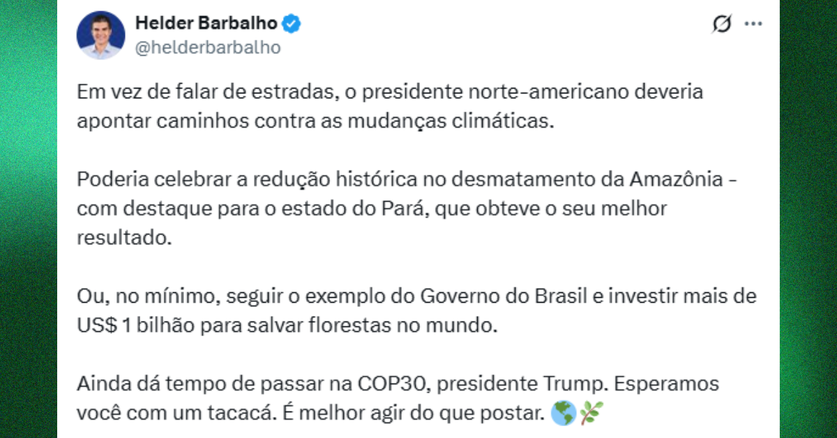 Helder também ironizou o comportamento de Trump nas redes sociais, convidando-o para visitar a COP30 em Belém: “Ainda dá tempo de passar na COP30, presidente Trump. Esperamos você com um tacacá. É melhor agir do que postar”, escreveu.